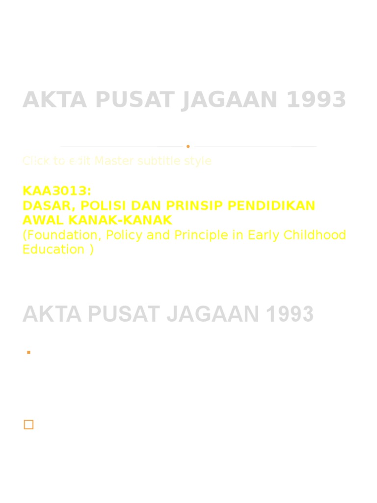 Akta pusat jagaan 1993 akta pusat jagaan 1993 (akta 506) bertujuan untuk menyediakan peruntukan bagi pendaftaran, pengawalan, dan pemeriksaan pusat jagaan dan bagi perkara yang berkaitan dengannya.