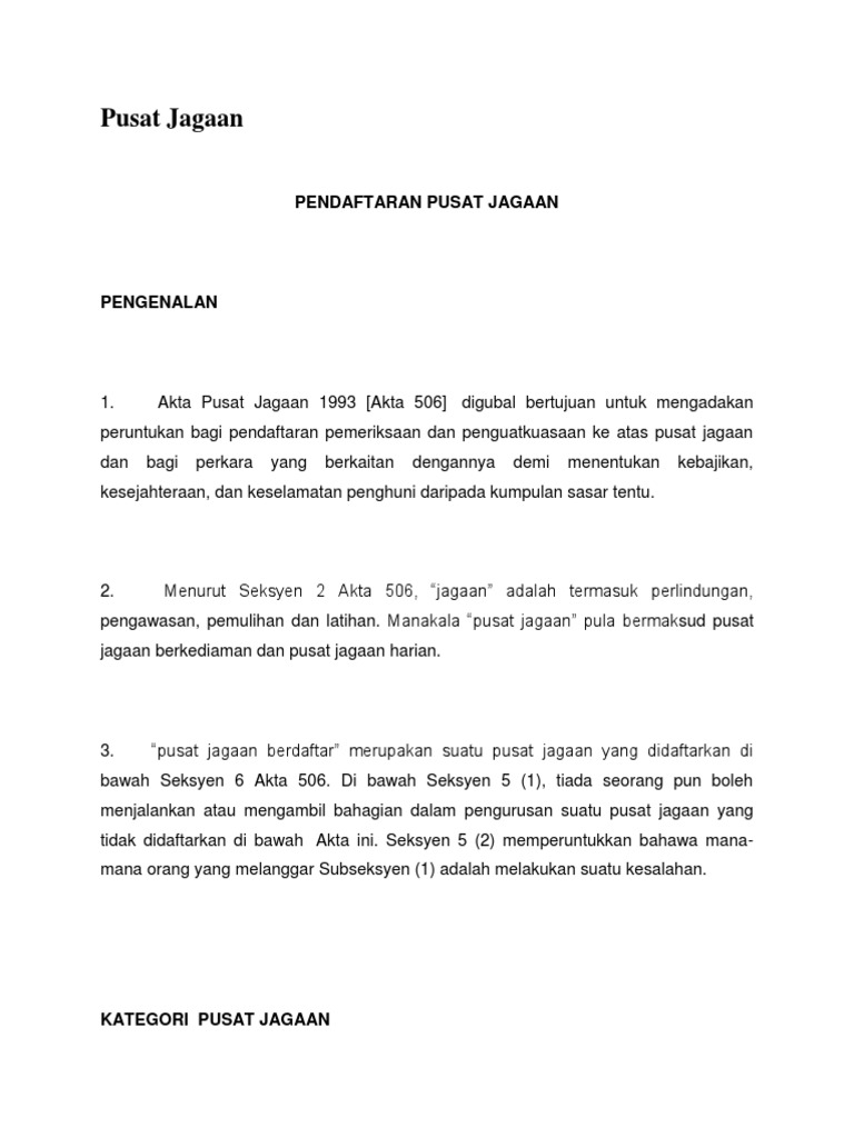 Care centres act 1993 (act 506) & regulations : Akta pusat jagaan 1993 akta 506 digubal bertujuan untuk mengadakan peruntukan bagi pendaftaran pemeriksaan dan penguatkuasaan ke atas pusat jagaan dan bagi perkara yang berkaitan dengannya demi menentukan kebajikan, kesejahteraan, dan keselamatan penghuni diutamakan. Akta pusat jagaan 1993 akta pusat jagaan 1993 (akta 506) bertujuan untuk menyediakan peruntukan bagi pendaftaran, pengawalan, dan pemeriksaan pusat jagaan dan bagi perkara yang berkaitan dengannya. Akta pusat jagaan 1993 dan peraturanperaturan pusat jagaan 1994). Ia juga dalam proses pendaftaran dengan jabatan kebajikan masyarakat agar mendapat kelulusan untuk menjadi sebuah pusat jagaan yang layak mengikut peruntukan di bawah akta pusat jagaan 1993.